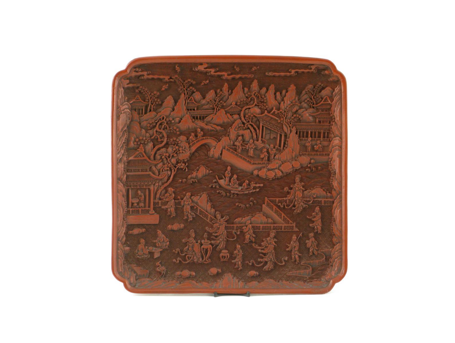 A Chinese red cinnabar lacquer tray 19th century, deeply carved in relief with many figures on a terrace, on a bridge and in a boat, engaged in pleasurable pursuits in a mountainous, watery landscape, the reverse with a six character Qianlong mark, 32cm.