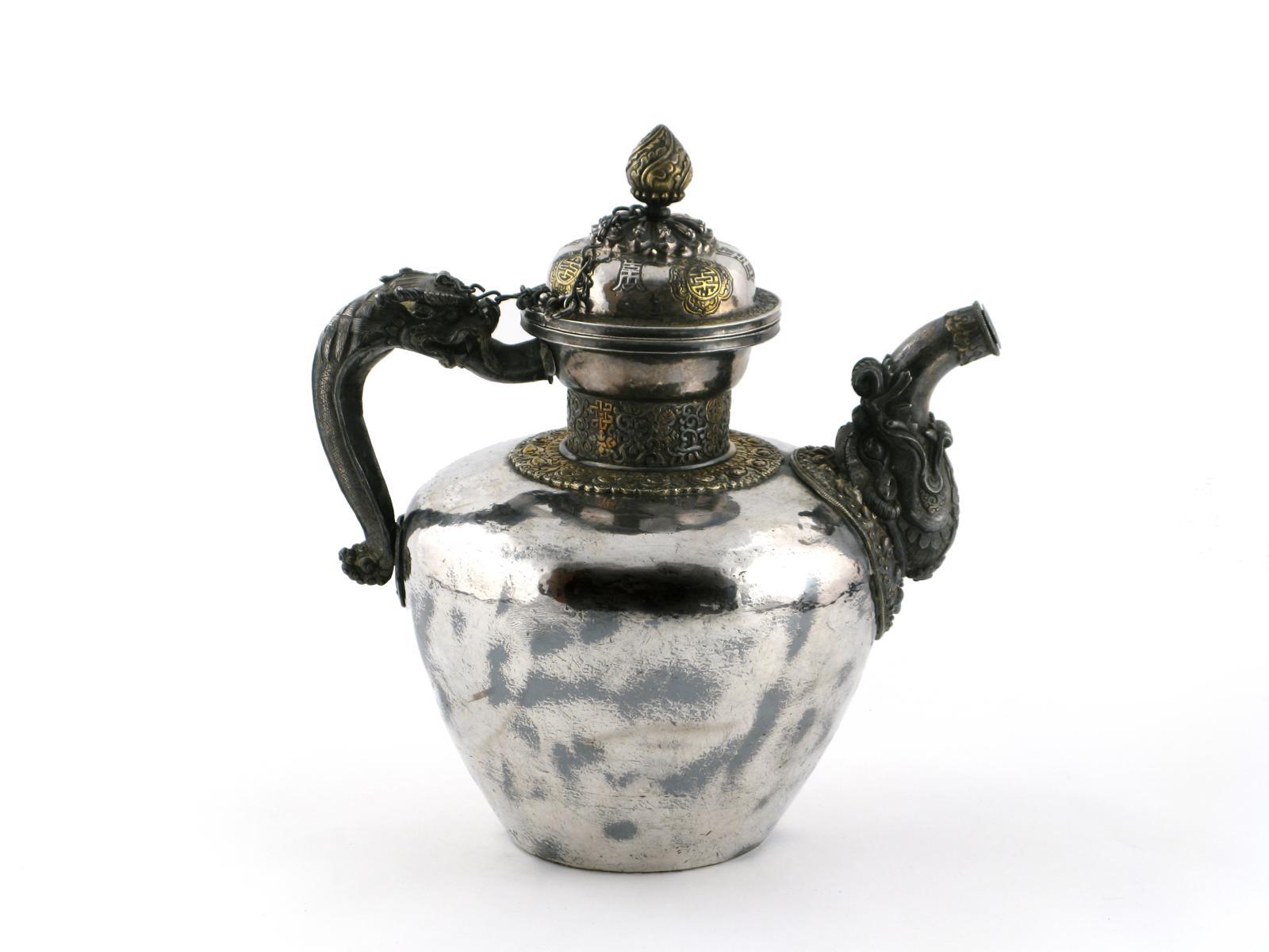 A large Tibetan silver and parcel gilt ewer and cover 19th century, cast with an animal spout and handle, the cover with shou characters, joined by a chain to the thumbpiece, the neck cast with scrollwork, 34.5cm high. (2)