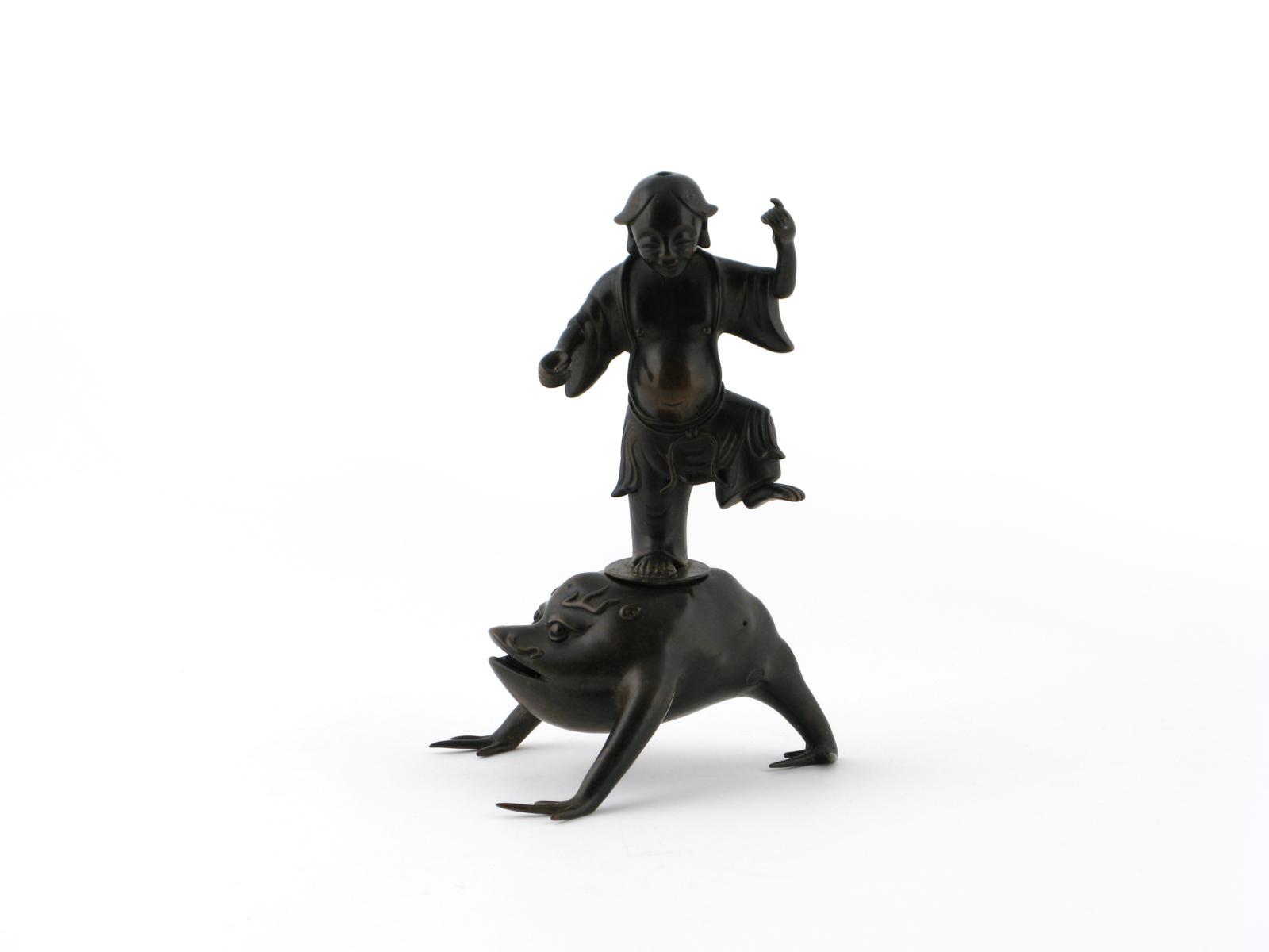 A Chinese bronze model of Liu Hai 17th century, standing on one leg upon the back of his three-legged toad, 22.5cm. (2)