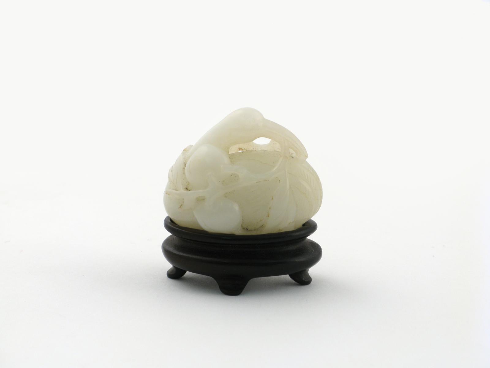 A Chinese white jade model of a crane perhaps 18th century, its legs tucked beneath its body, its head turned back over its shoulder, and holding a fruiting peach branch in its beak, 4.2cm. Together with a wood stand. (2)