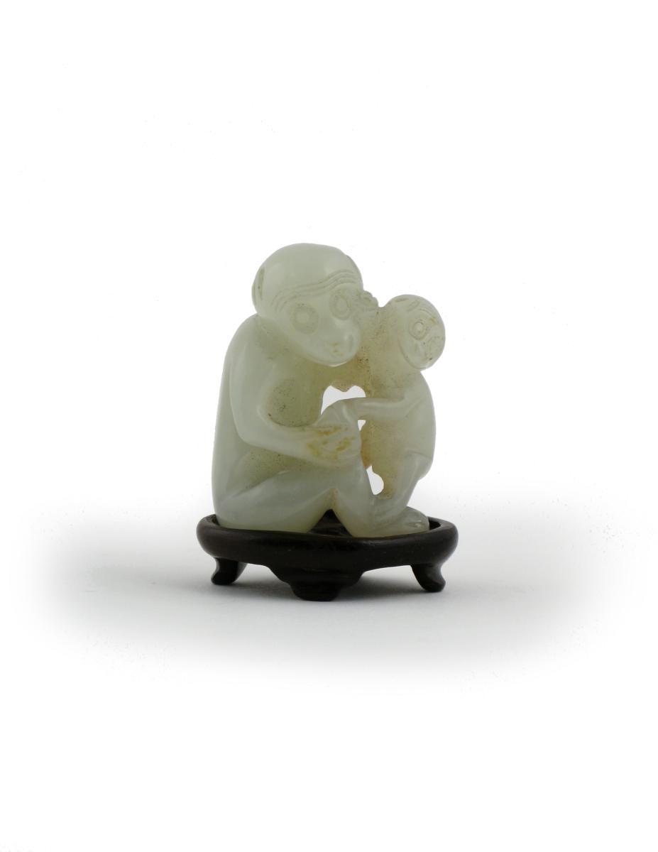 A Chinese pale celadon carving of a monkey and its young 18th / 19th century, sitting and holding a peach in one hand, together with a wood stand, 4.2cm. (2)