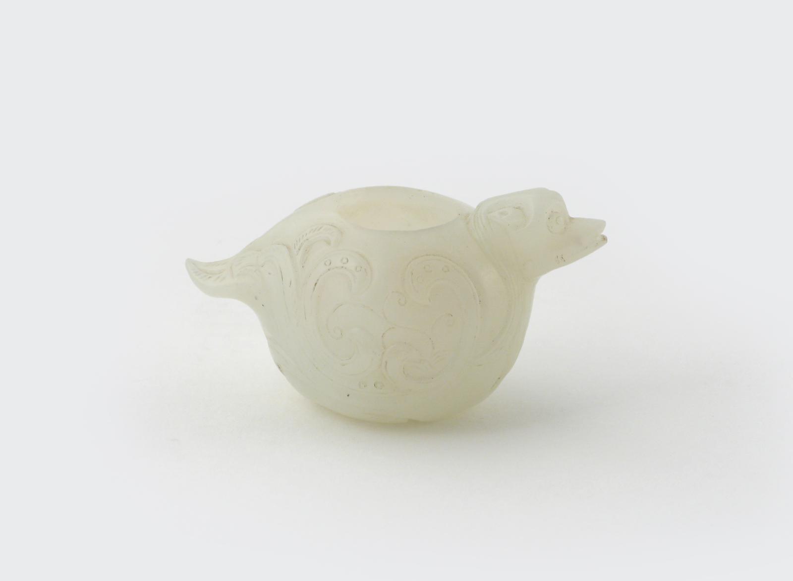 A Chinese white jade water dropper probably 19th century, with a round body carved with stylized feathers, and a short stubby tail, 7cm.