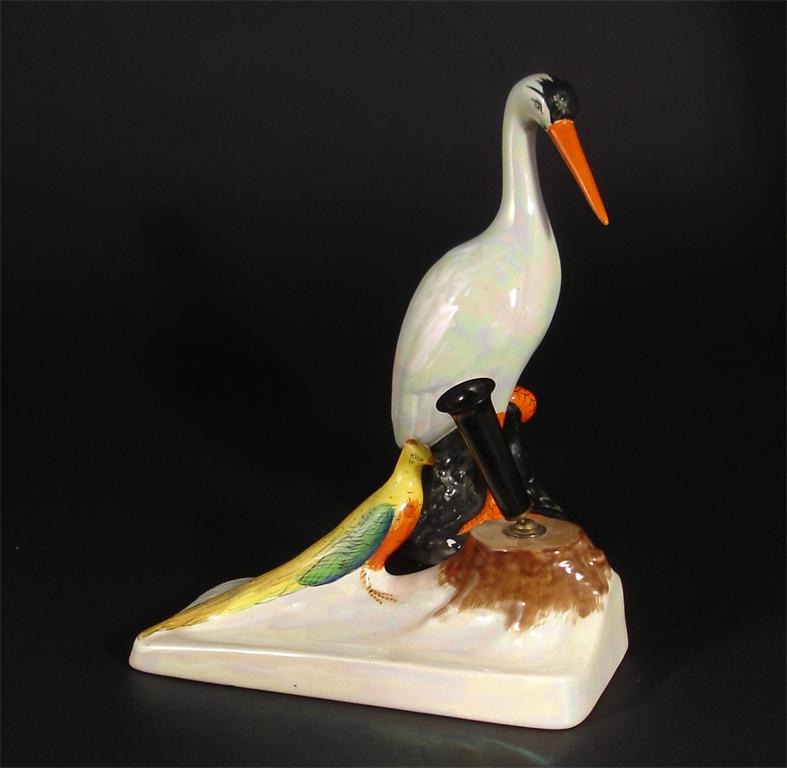 A Carlton Ware desk pen holder modelled as an exotic bird beside a tree stump, and a figure of heron printed marks 18cm. wide.
