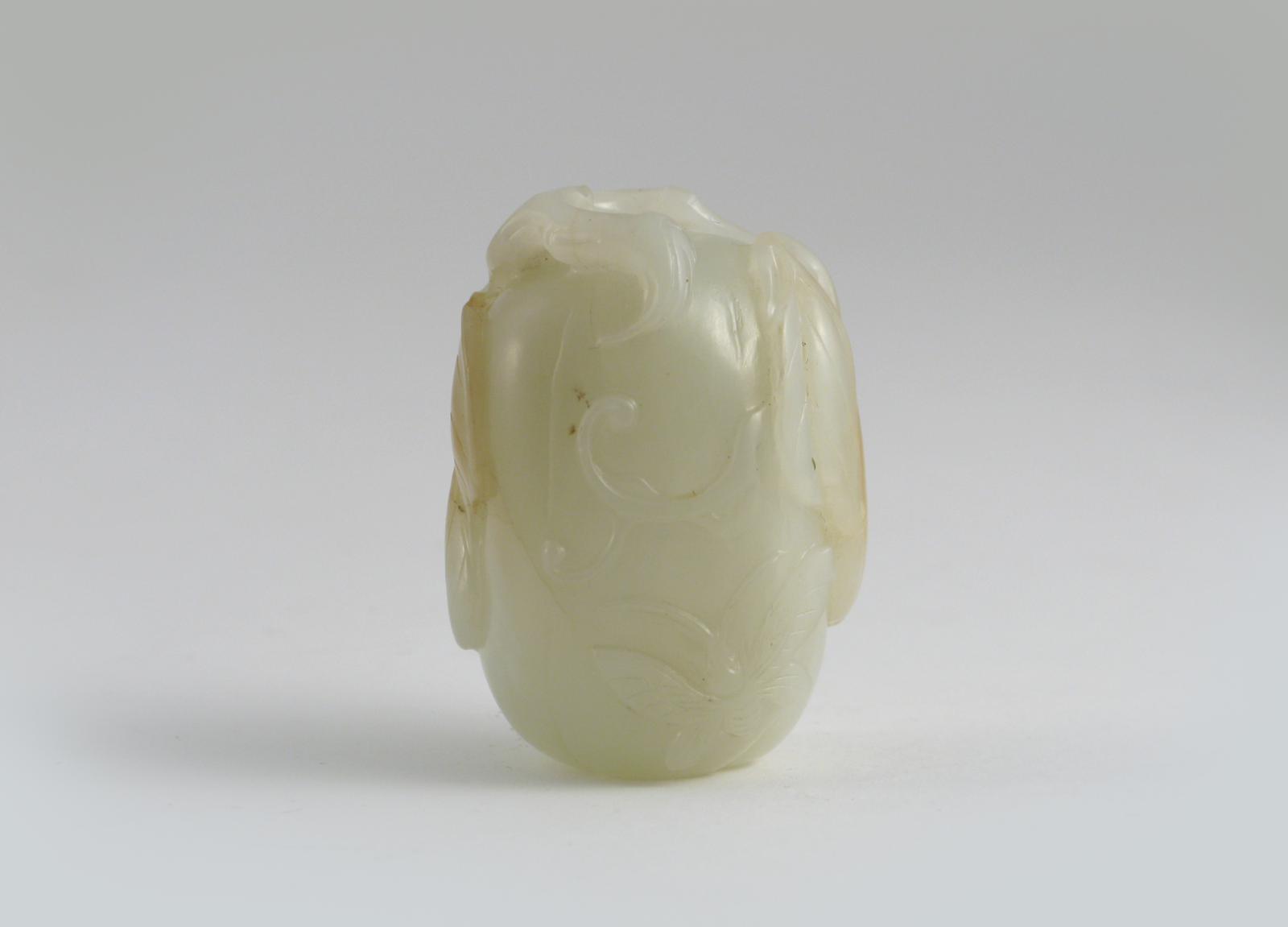A Chinese pale celadon jade snuff bottle 19th century, carved as one large and one small melon issuing from a leafy stalk, and with a butterfly to one side, 5cm.