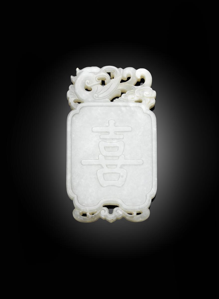 A Chinese white jade plaque 18th / 19th century, one side carved with a boy and a bat, the reverse with a single xi (joy) character, and with a phoenix surmount, 6.5cm.