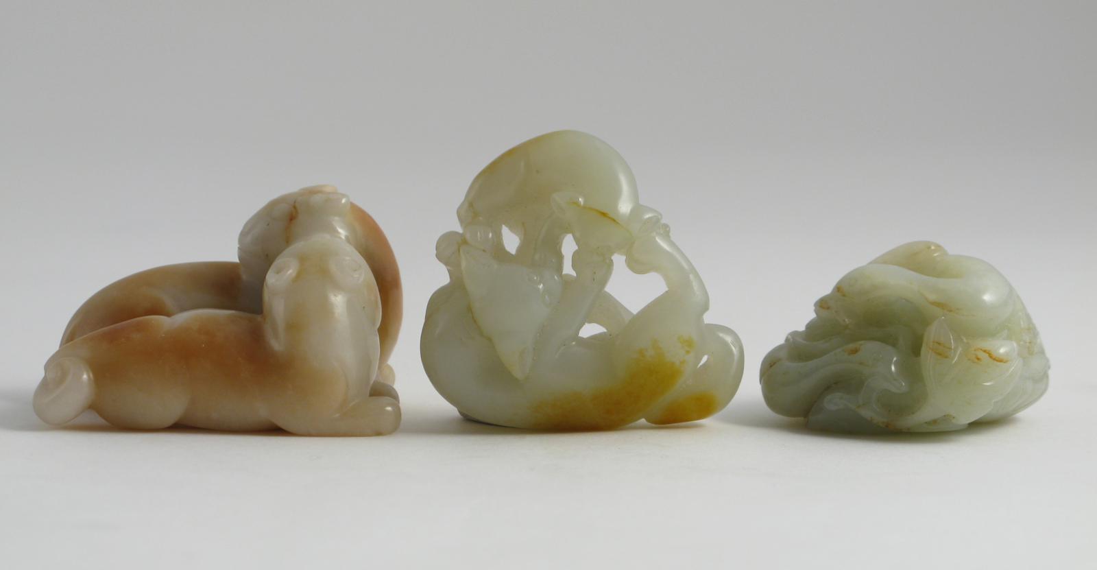 Three Chinese jade animal carvings 19th / 20th century, one of two geese on a lotus leaf, another of two cats, the third of two squirrels, 6.5cm. (3)