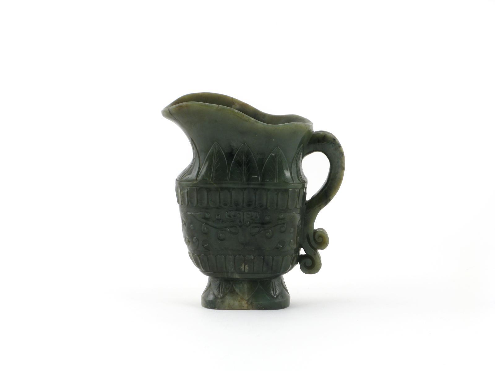A Chinese spinach-green jade ewer four character Qianlong mark to the foot but probably 20th century, carved with taotie masks to the sides between bands of stiff leaves, 16.8cm.
