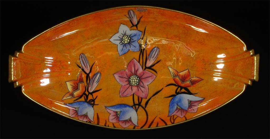 A Carlton Ware twin-handled dish pattern no.4154 printed and painted with anemone type flowers on an orange lustre ground printed and painted marks, paper label 32cm. wide.