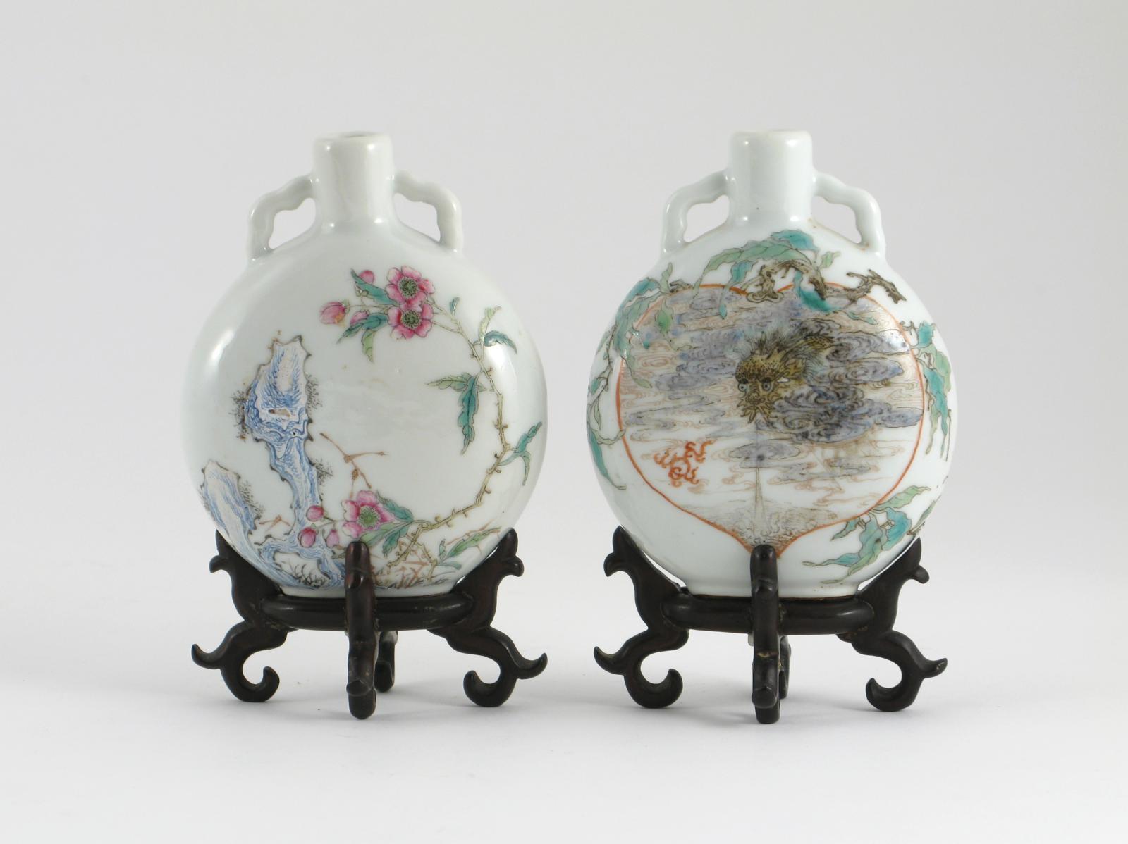 A pair of Chinese famille rose small moonflasks c.1900, one painted with a large peach-shaped panel containing a dragon, and with a crane to the reverse, the other with prunus, rockwork and a large cricket, each with a three character mark, together with hardwood stands, the stands damaged, 11cm. (4)