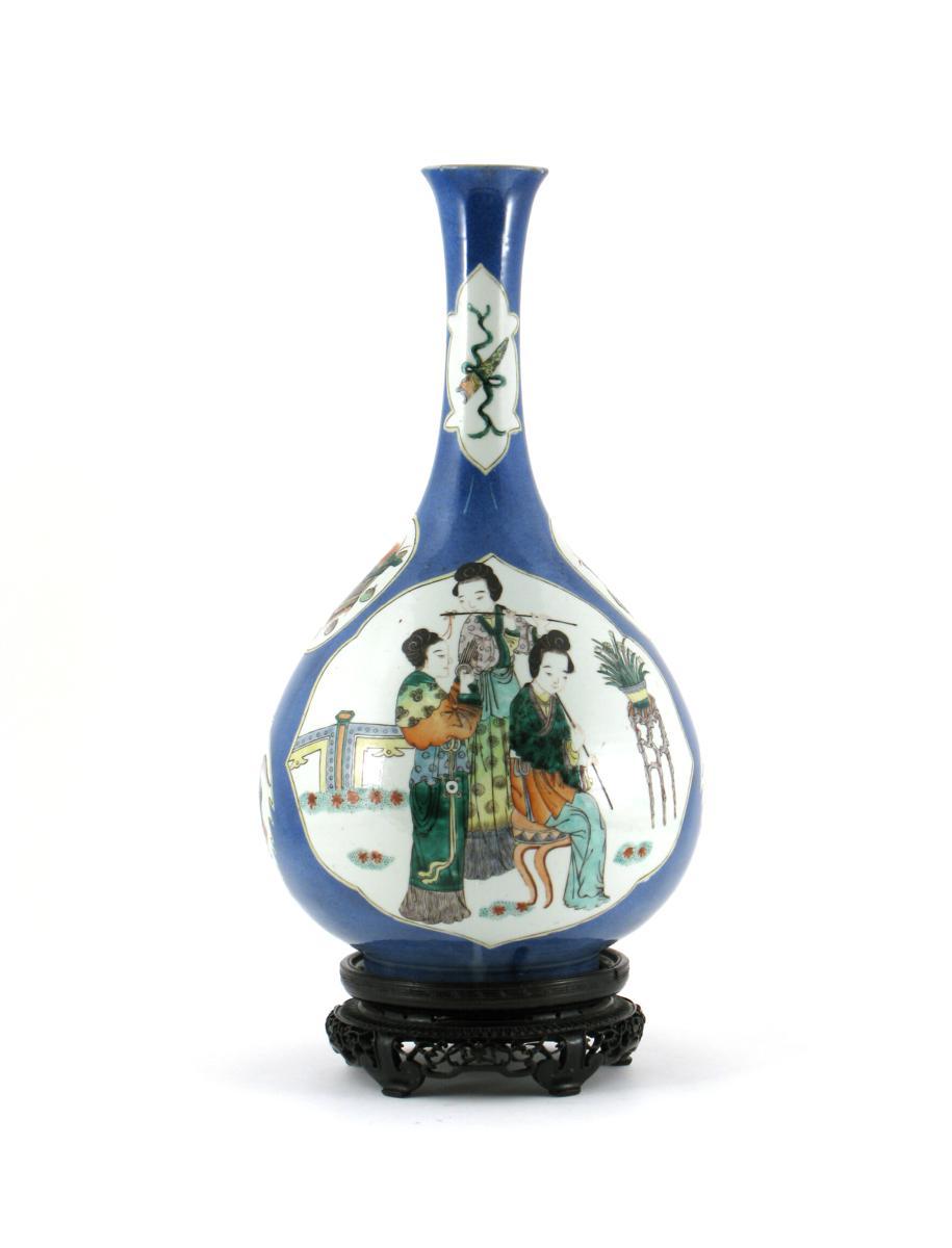 A large Chinese powder blue ground vase 19th century, painted with two large panels, one of three maiden musicians, the other with a peacock, prunus and peony, 45.5cm. Together with a hardwood stand. (2)
