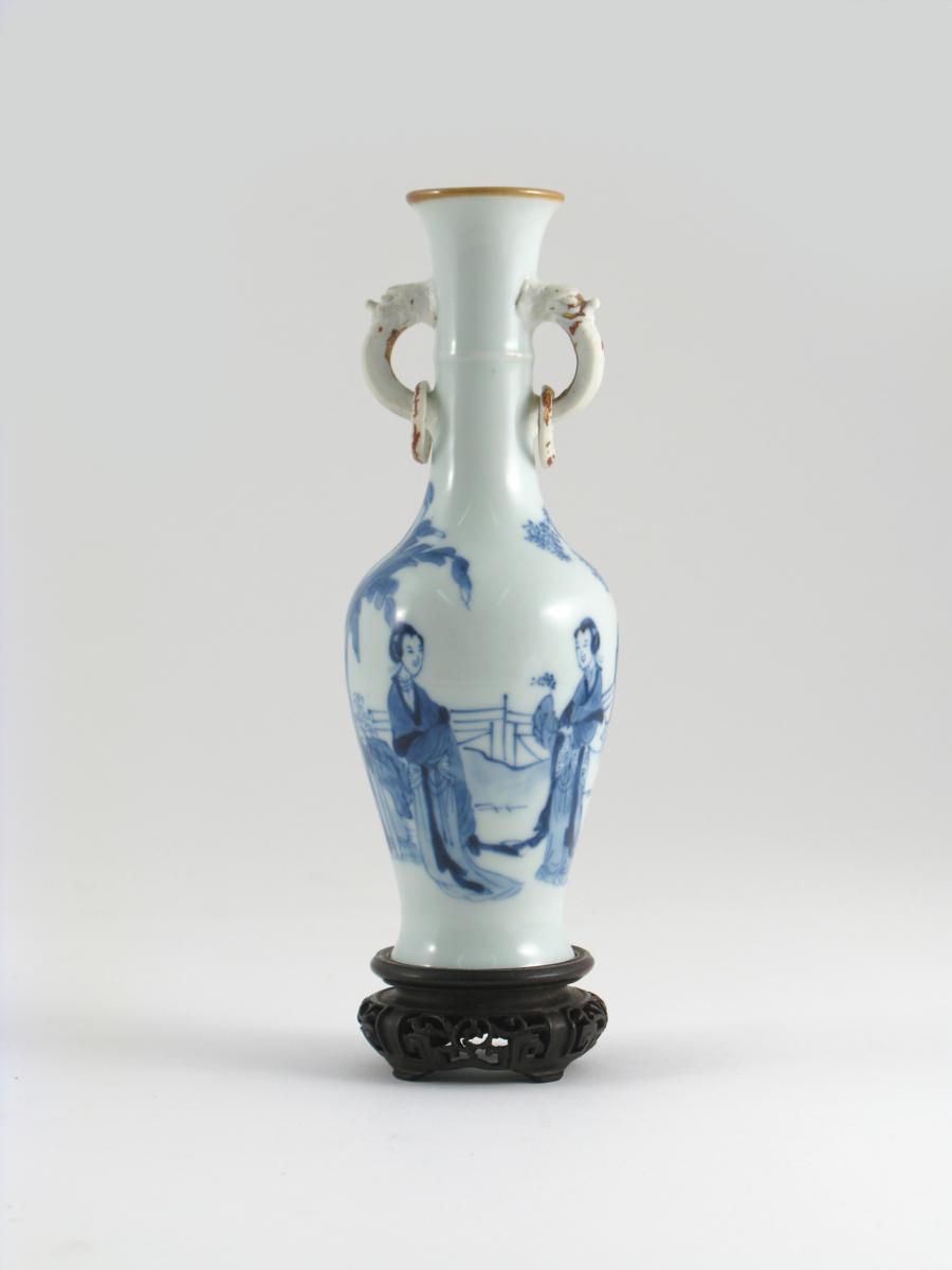 A small Chinese blue and white vase Kangxi 1662-1722, with ring handles to the neck and painted with four maidens in a garden, 17cm. Together with a hardwood stand. (2)