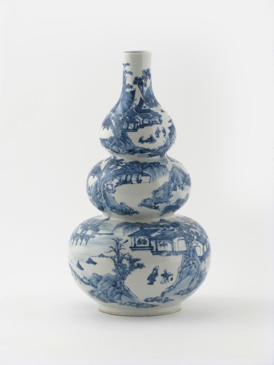 A large Chinese blue and white gourd-shaped vase six character Tongzhi mark and of the period 1862-74, painted all over with a continuous scene of figures going about their daily lives in a mountainous and watery landscape, 43.5cm.