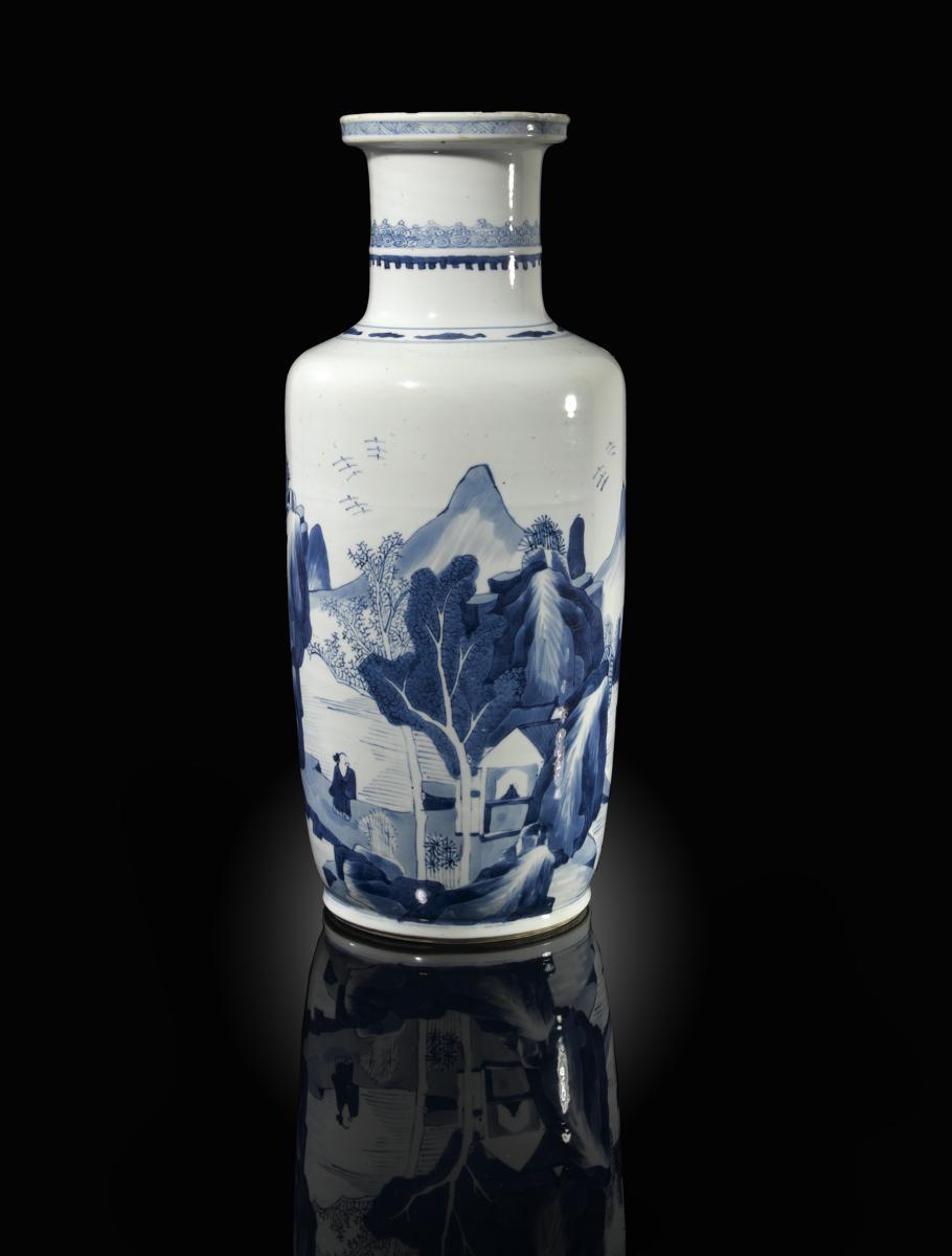 A large Chinese blue and white rouleau vase Kangxi 1662-1722, painted with a scholar crossing a rocky causeway, and with a figure seated near the window of a house nestled beneath mountains, trees, migrating birds and the moon, small rim frits and a small hairline to the neck, 44.3cm.