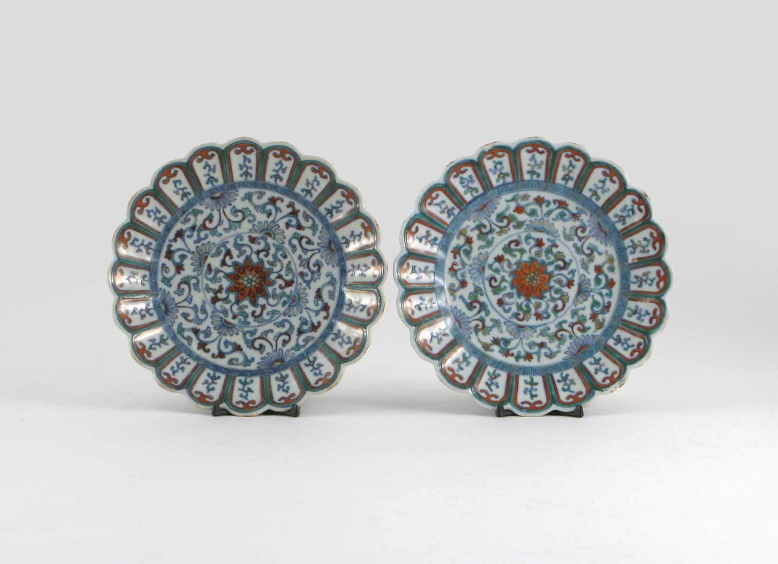 A pair of Chinese doucai petal-shaped dishes six character Qianlong seal marks, c.1790, each painted with flowers, foliage and stylized scrolls, chips to the feet and rims, 16cm. (2)