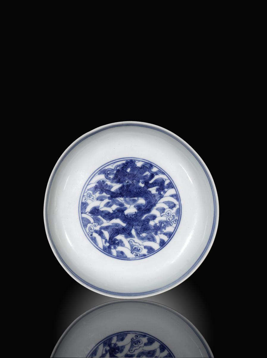 A Chinese blue and white dragon saucer dish Jiajing six character mark and of the period, 1522-1566, painted with a large circular medallion containing a confronting five-clawed dragon amidst waves, the reverse with two further dragons, all within double-line borders, a faint 1cm rim crack, 19.6cm.