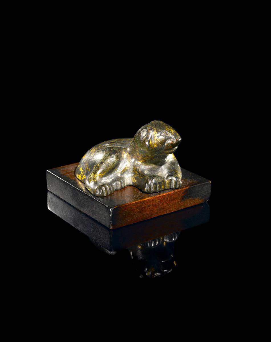 A rare Chinese bronze scroll weight Ming dynasty 1368-1644, in the Han dynasty style, formed as a recumbent large cat, with two columns of calligraphy beneath the base, the surface with traces of gilding, 6.6cm. Together with a wood stand. (2)