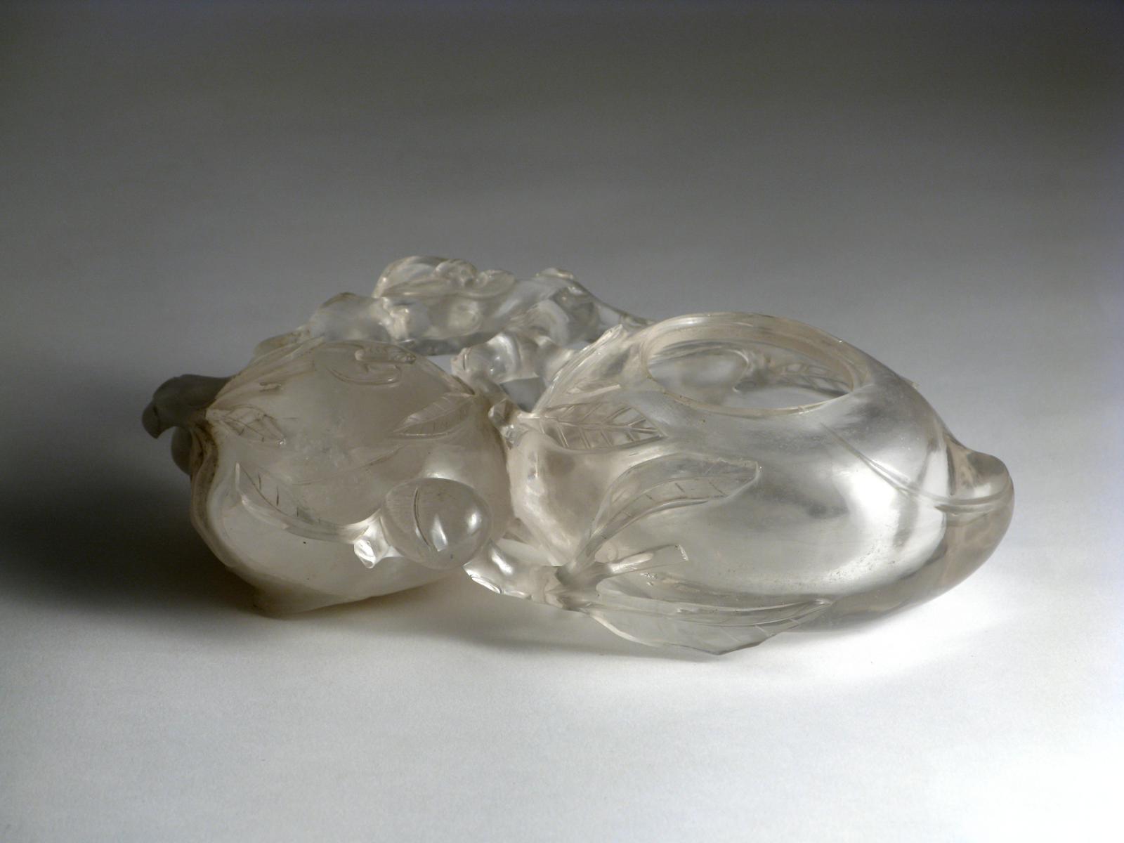 A large Chinese rock crystal brush washer 19th century, carved as two large and two small peaches, issuing from a gnarled leafy stem, and with two small bats, 20cm long.