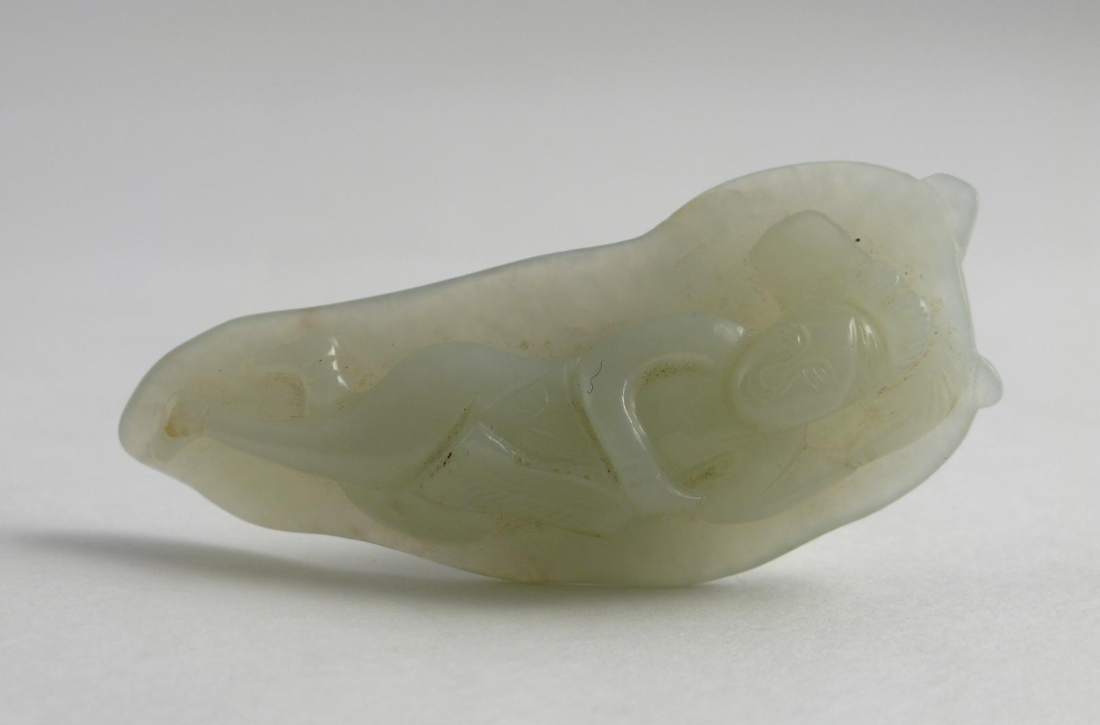 A Chinese pale celadon carving 19th century, of a woman holding a fan, reclining upon a large artemesia leaf, 7.2cm.