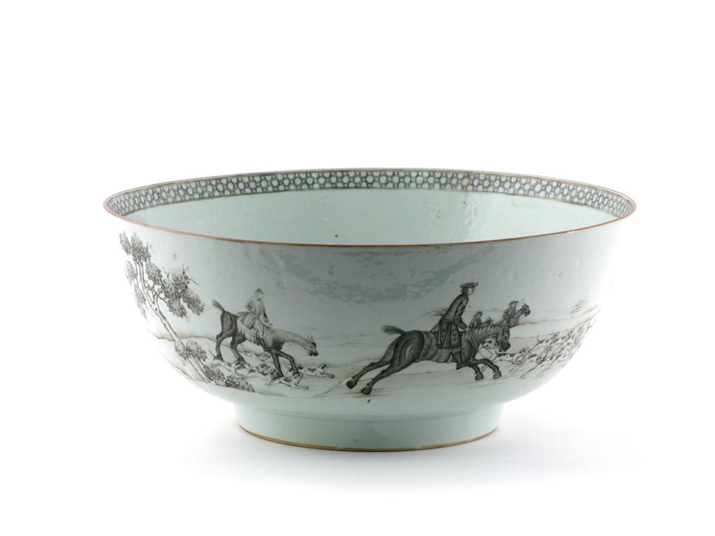 An unusual Chinese fox hunting bowl c.1780, painted en grisaille with equestrian figures and a pack of hounds in pursuit of a fleeing fox, the interior with a diaper border, 39.3cm.