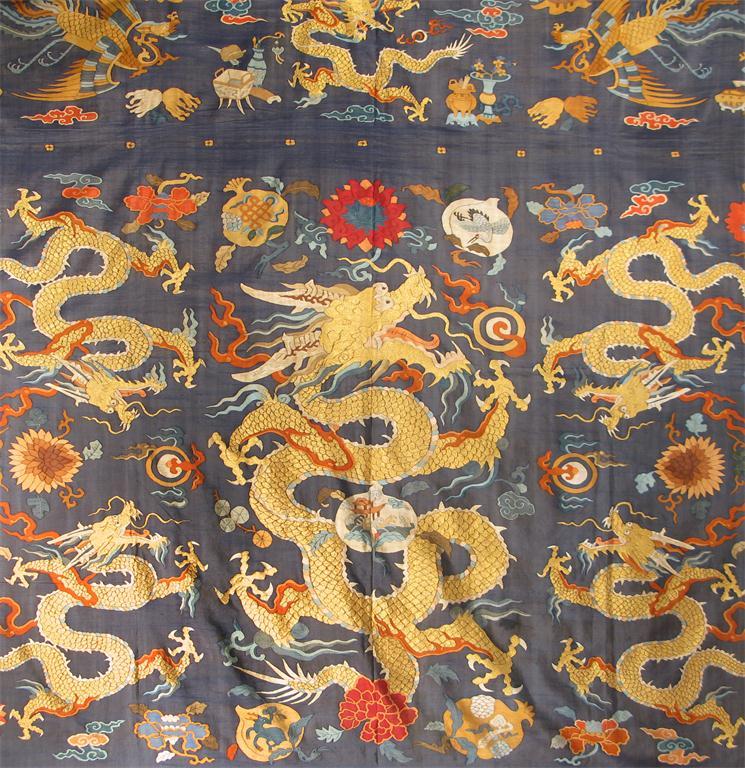 WITHDRAWN A large Chinese silk panel depicting five dragons amidst fruit and flowers beneath a border of dragons and phoenix, 187cm x 203cm.