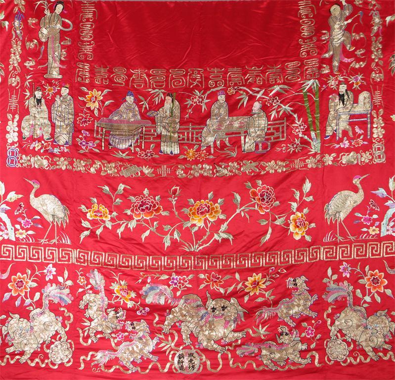A large Chinese red silk panel 20th century, decorated in gold thread and polychrome with figures, birds and flowers, all beneath a dragon border, 400cm x 189cm.