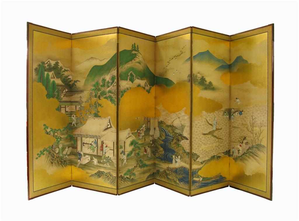 A Japanese six panel screen 19th century, depicting the cultivation of rice with many figures in a mountainous landscape, 170cm high x 377cm wide.