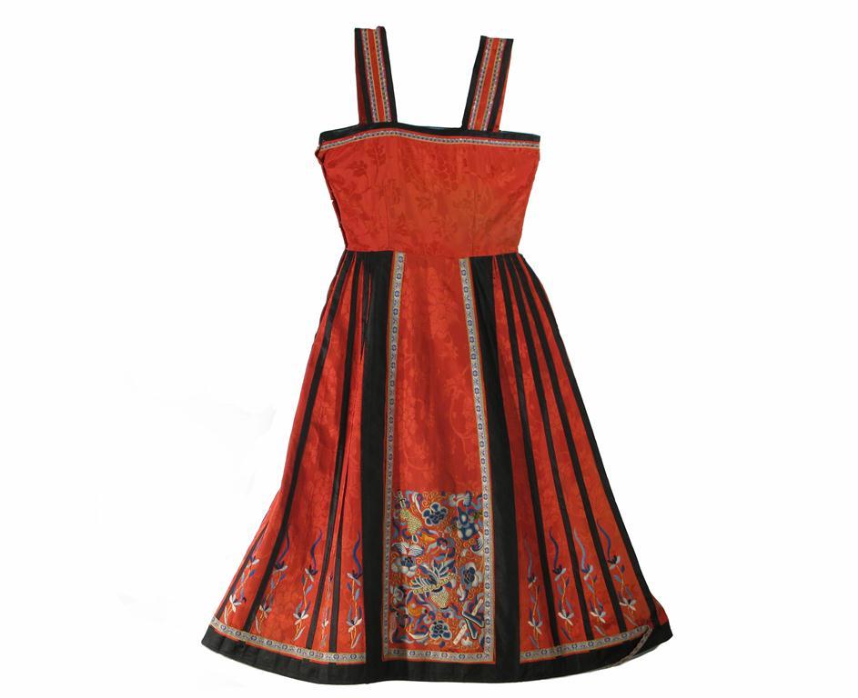 A Chinese red silk dress c.1900, and a small red silk bolero, 120cm max. (2)