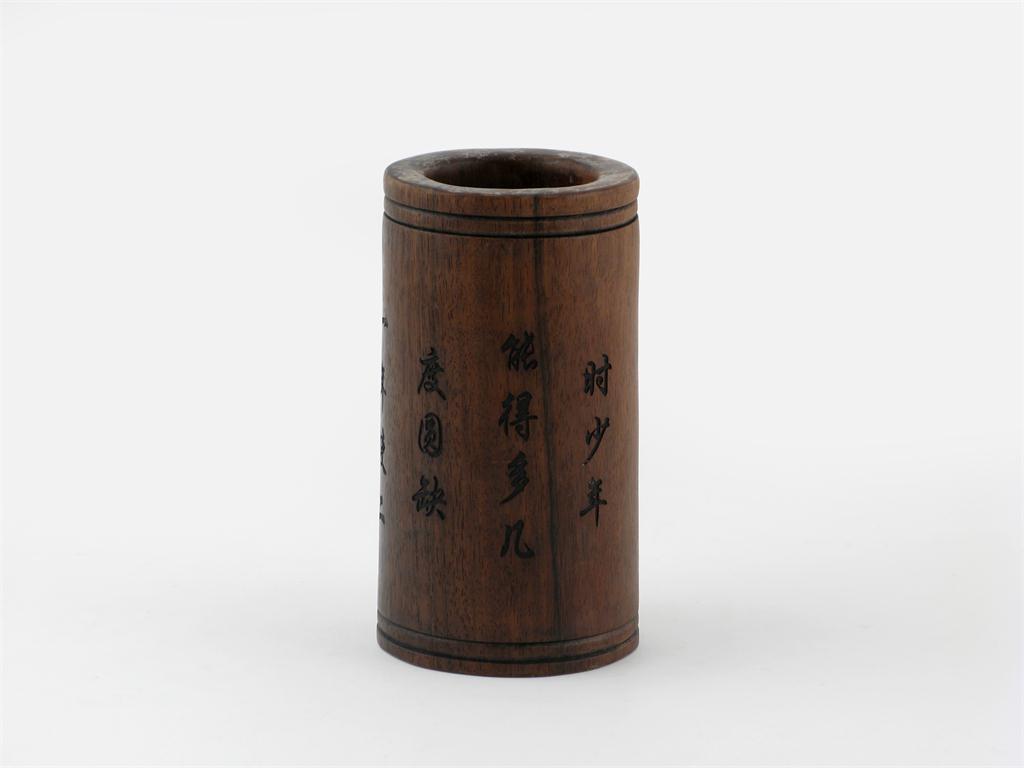 A Chinese hardwood brush pot 20th century, carved with a vase containing peony and with four columns of calligraphy, 16.5cm.