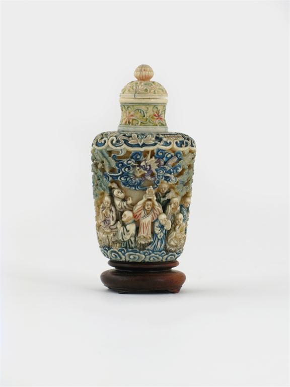 A Chinese ivory snuff bottle and stopper 19th century, carved in relief with many small figures and a flying dragon between pine trees, together with a wood stand, 10.5cm. (2)