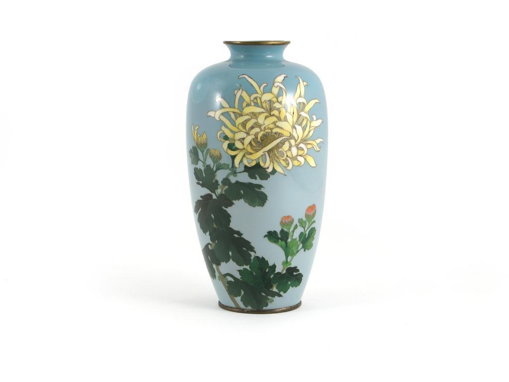A Japanese cloisonné ovoid vase early 20th century, decorated with a large chrysanthemum on a dove grey ground, impressed factory mark, some damages, 18.7cm.