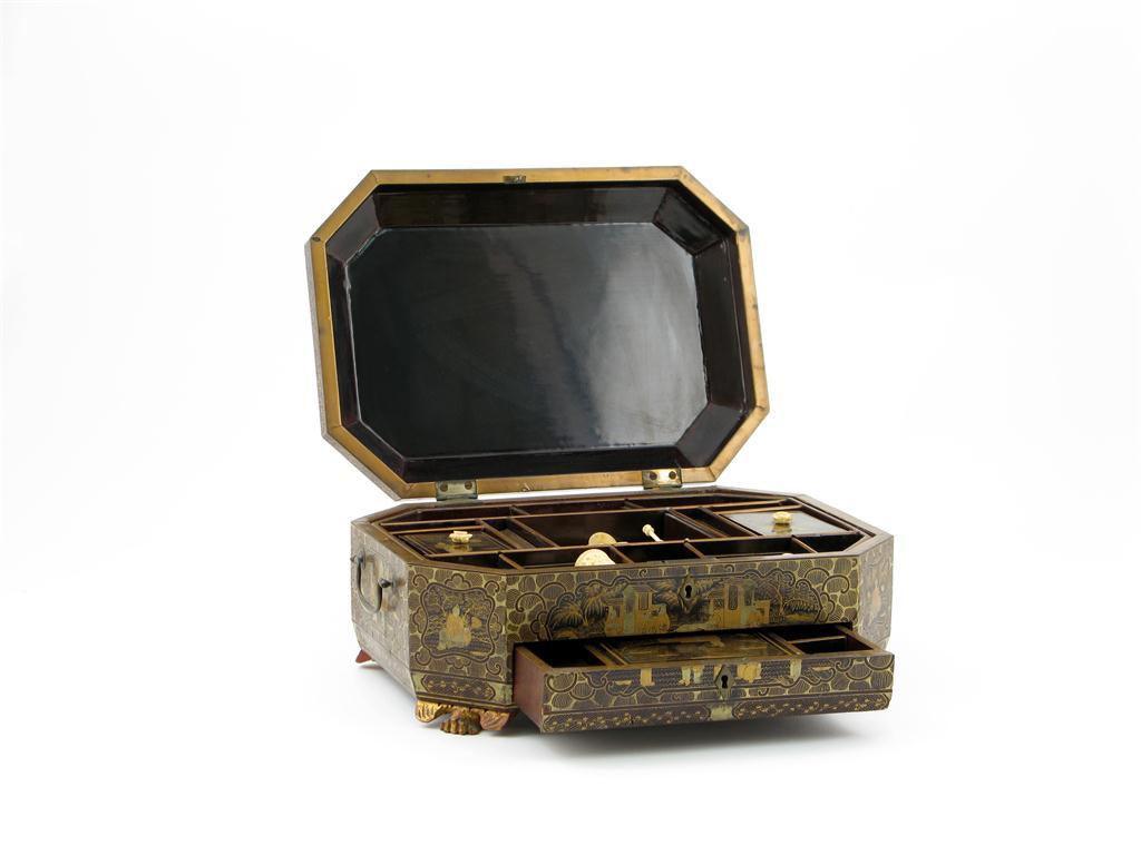 A Chinese black and gold lacquer sewing box 19th century, with a lift out tray containing sewing implements, and a drawer to the base, wear and damages, 36cm across.