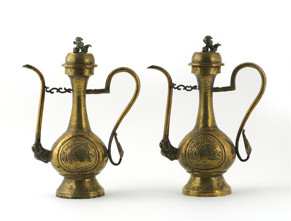 A pair of Chinese brass ewers and covers 16th / 17th century