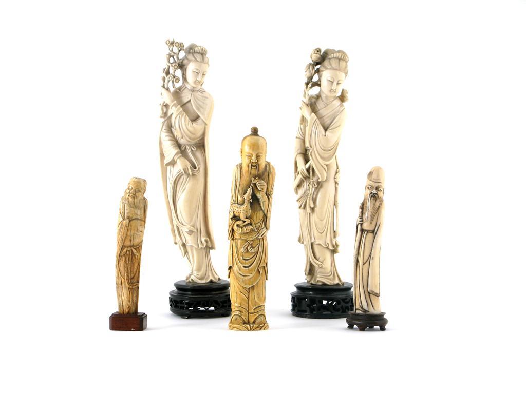 Five Chinese ivory figures 17th century and later, one carved as Shoulao, two as sages and two as elegant young ladies, 31cm max. (5)