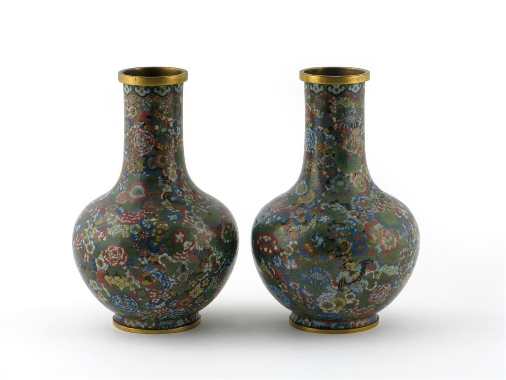 A pair of Chinese cloisonné bottle vases 19th century, decorated with a millefleurs design, 26.5cm. (2)
