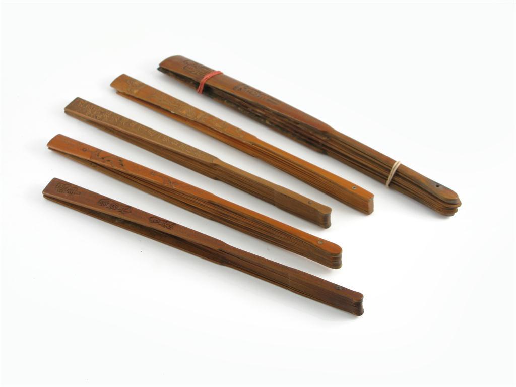 Five Chinese bamboo and wooden fan ends 19th century, damages, 34.5cm max. (5)
