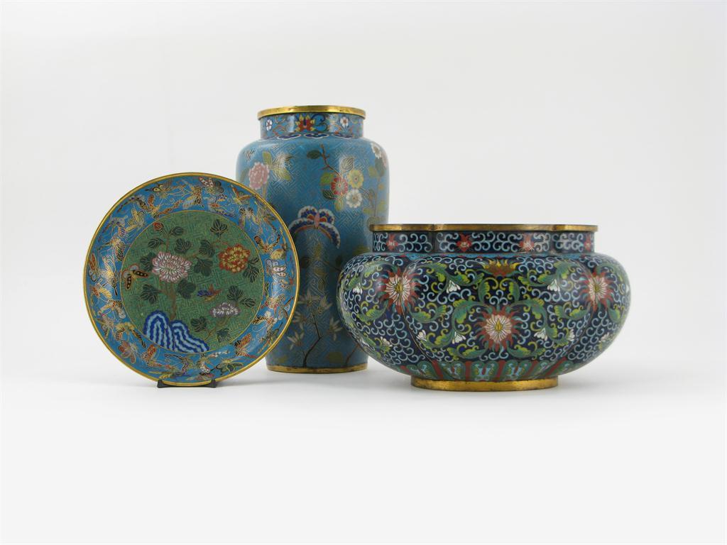 A Chinese cloisonné dish 19th century , decorated with flowers and foliage issuing from rockwork, a Chinese cloisonné quatre-lobed bowl and a tapering cylindrical vase, damages, 25cm max. (3)