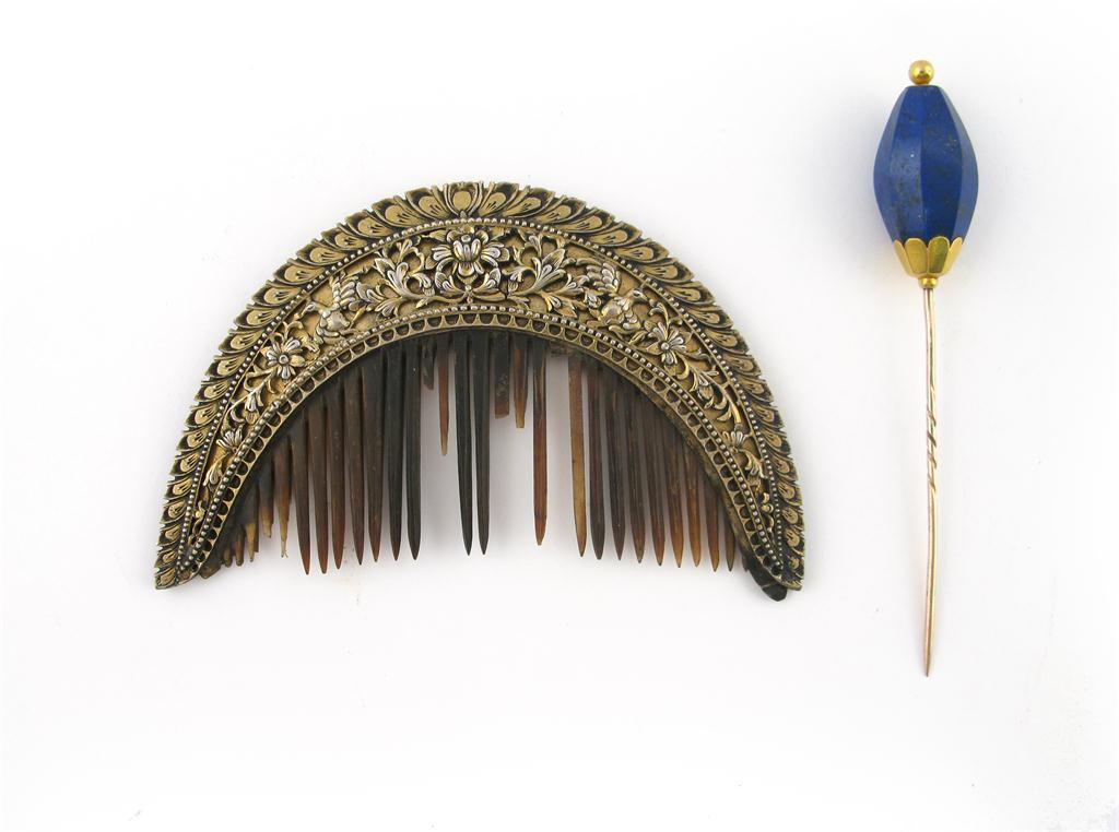 A Chinese lapis lazuli and gold hat pin 19th / 20th century, with a vivid blue faceted bead and a silver gilt comb chased with flowers, birds and foliage, the tortoiseshell comb damaged, 10.5cm. (2)