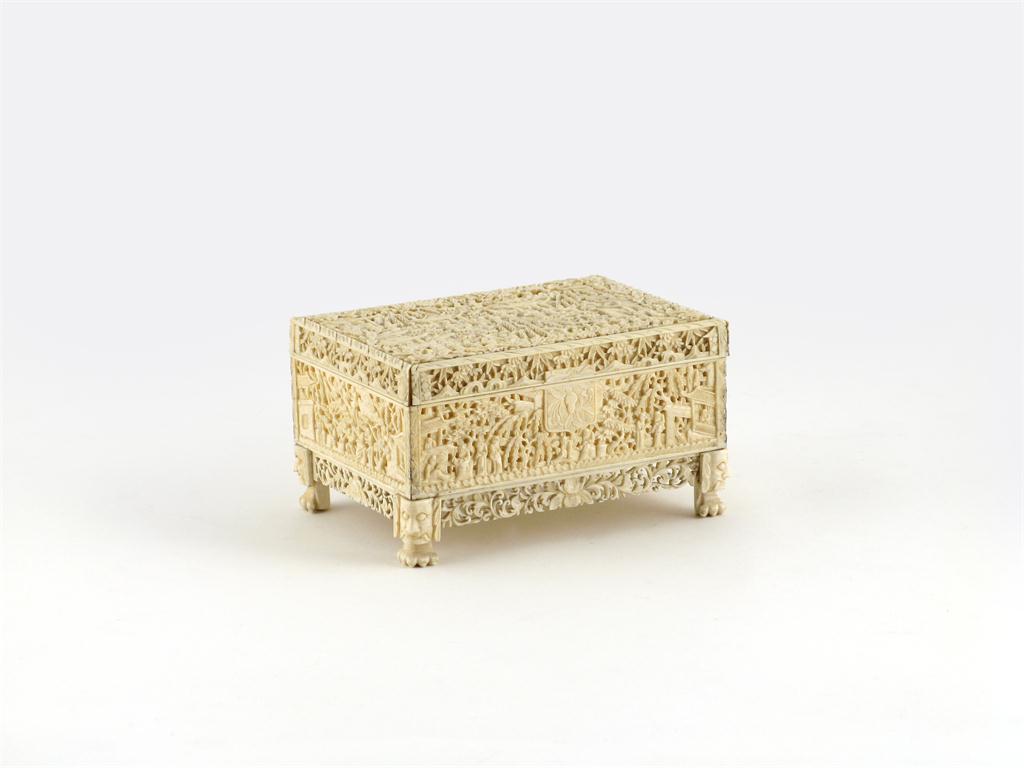 A Chinese Canton ivory box and cover 19th century, the sides and lid carved with a multitude of figures in pagodas, raised on four lion paw feet joined by fretwork, 14.5cm. (2)