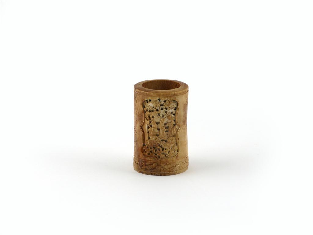 A small Chinese ivory brush pot 19th century, carved with two cartouches containing figures divided by columns of calligraphy, 8.4cm.