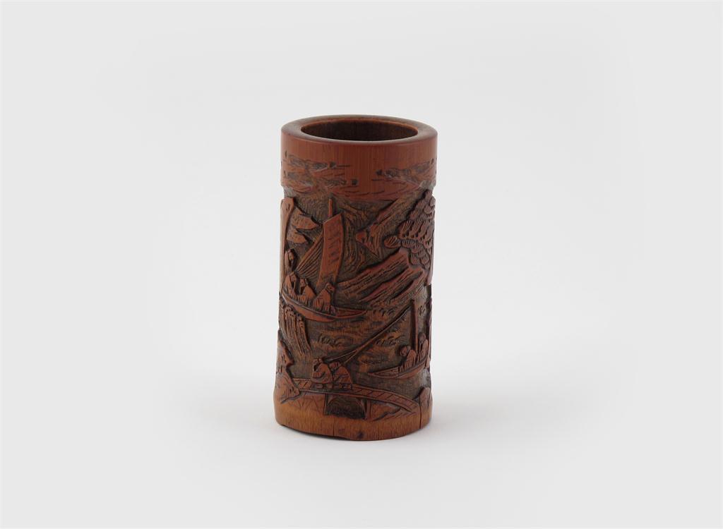 A small Chinese bamboo brush pot 19th / 20th century, carved with figures in boats in a watery mountain landscape, 12cm.