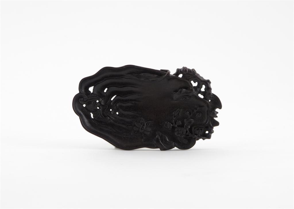 A Chinese zitan shallow dish 20th century, carved as a finger citron upon which two bats and a bee creep, the fruit issuing from a flowering gnarled leafy branch, 15cm.