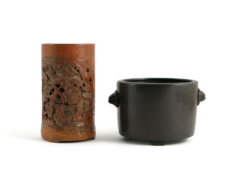 A Chinese bamboo brush pot 19th century, carved with scholars seated at a table beneath pine, and a small cylindrical bronze incense burner, the base with a six character Xuande mark, 12.2cm max. (2)