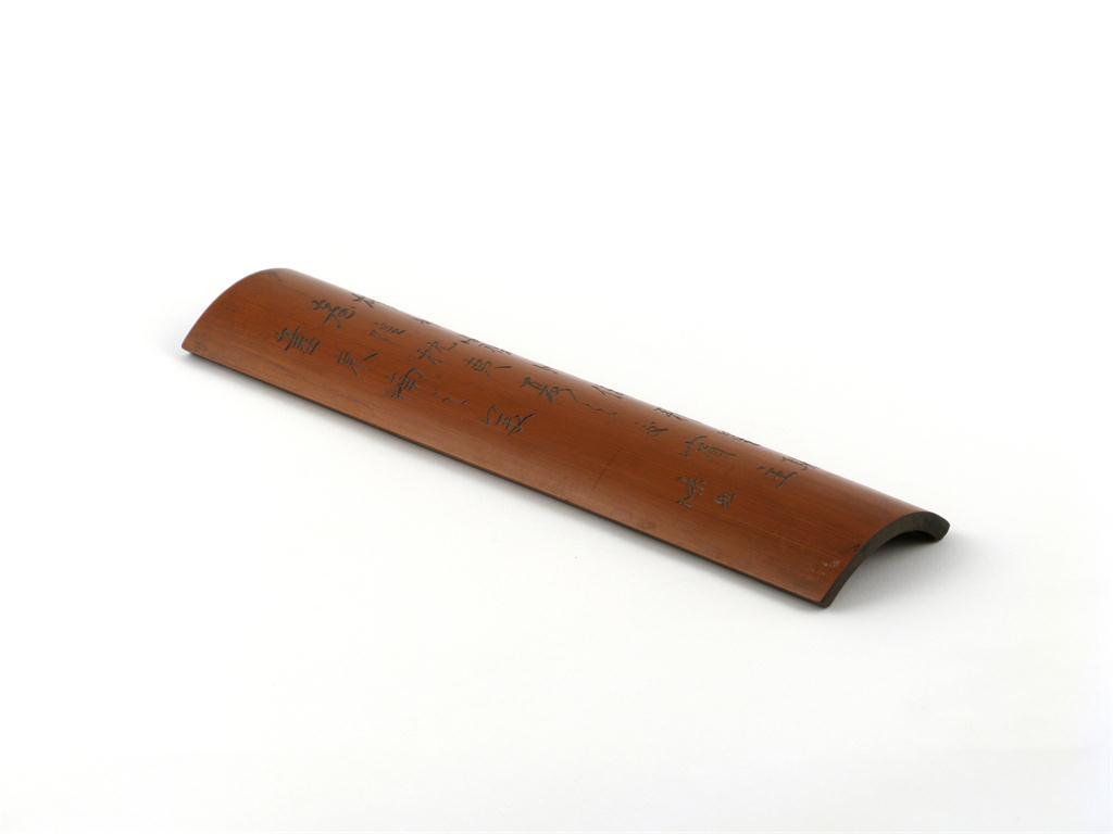 A Chinese bamboo wrist rest 19th / 20th century, carved with three columns of calligraphy, 31.5cm.