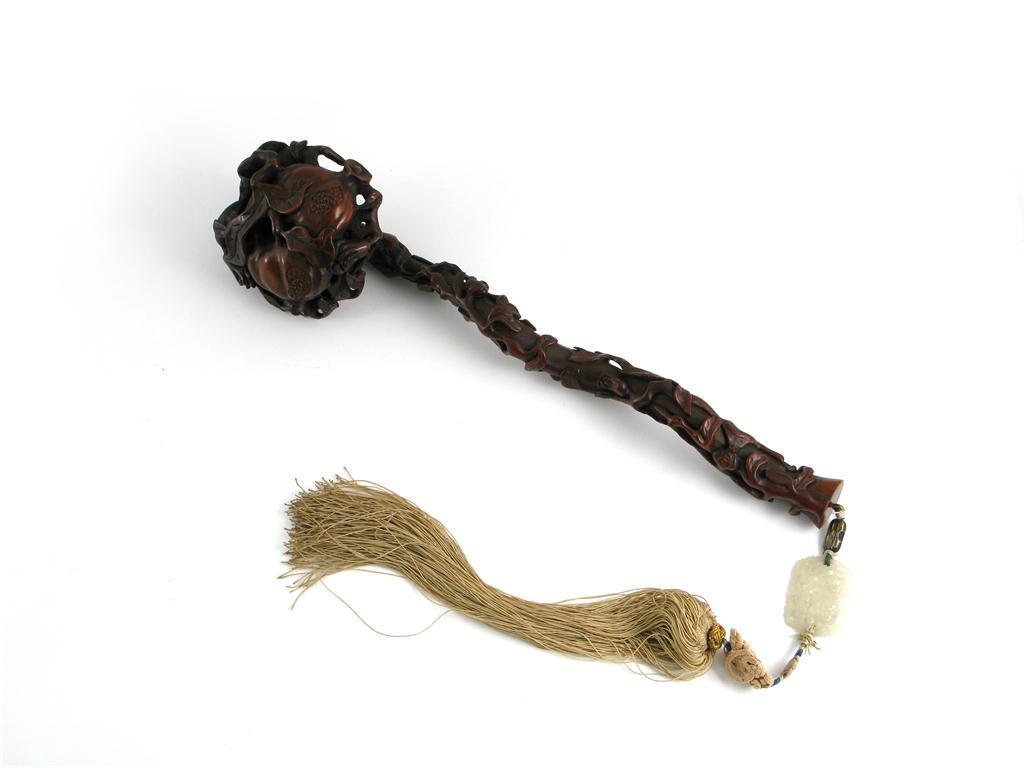 A Chinese hardwood ruyi sceptre, the head carved as two pomegranates and two finger citron amidst leaves, the stem with further fruits and foliage, 36cm.