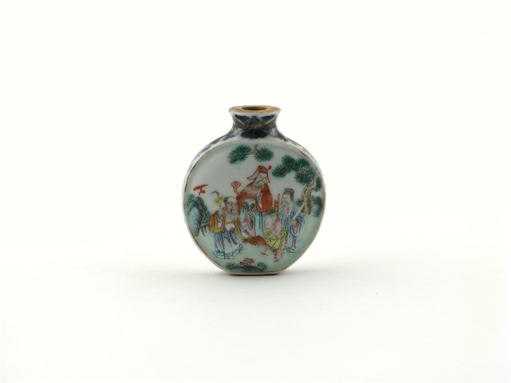 A Chinese famille rose snuff bottle four character Qianlong mark but probably later, each side painted with figures beneath pine trees, 5.5cm.