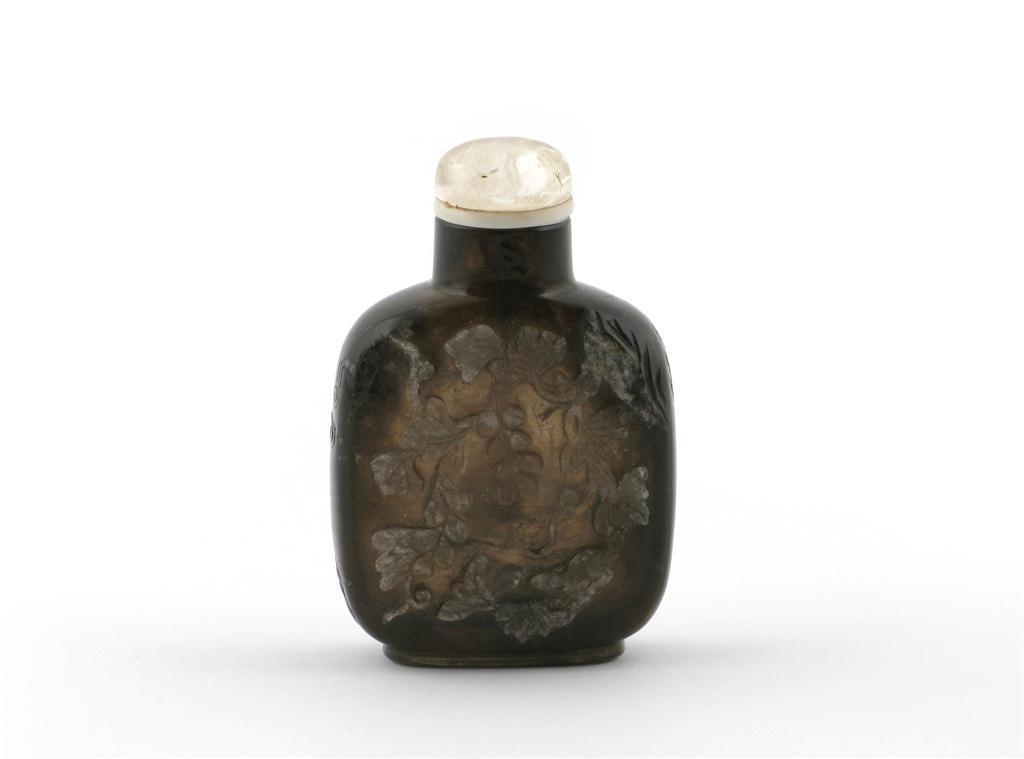 A Chinese smoky quartz snuff bottle 1st half 19th century, one side carved with a squirrel in a grapevine, the reverse with a small hut and a pine tree, 8cm.