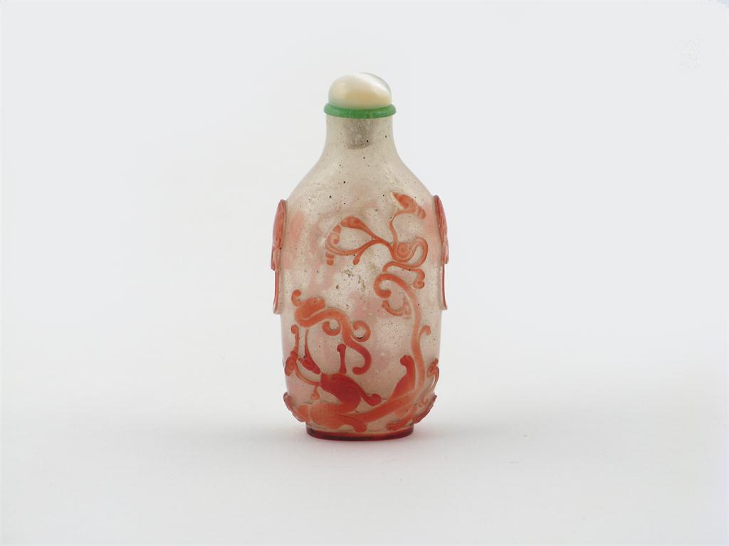 A Chinese red glass overlaid snuff bottle 18th / early 19th century, decorated with slender writhing dragons, 8cm.