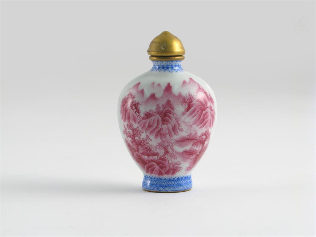 A Chinese famille rose snuff bottle four character Qianlong mark but later, painted in pink with a rocky landscape and with calligraphy to the reverse, 6.9cm.