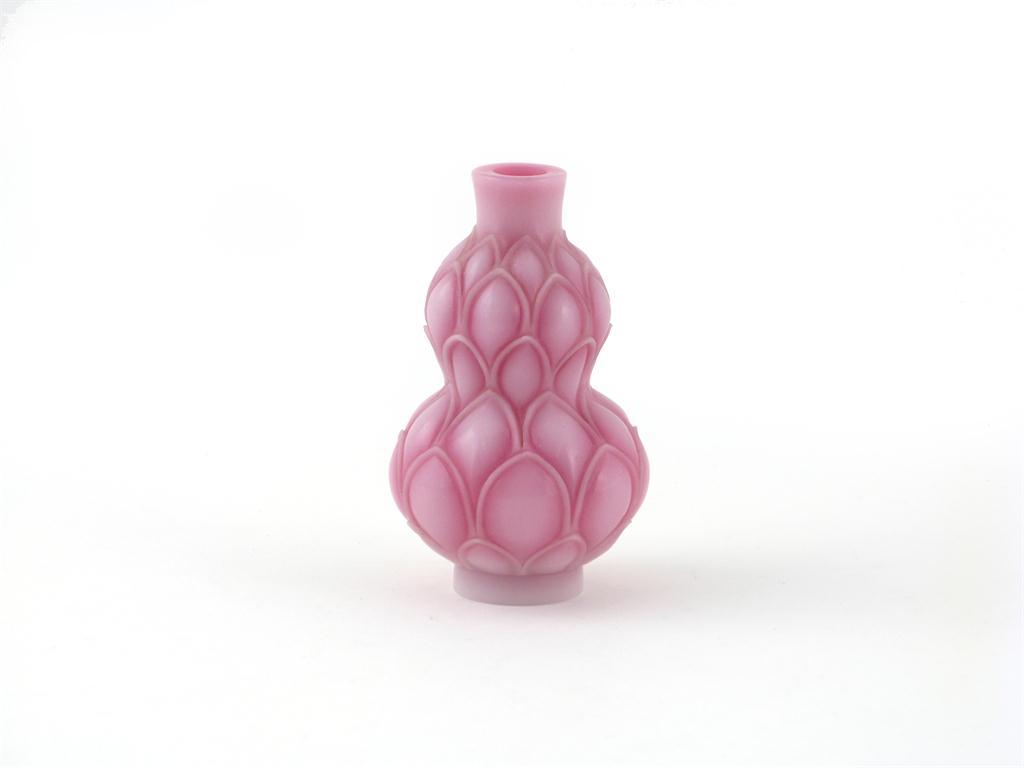 A Chinese pink Beijing glass gourd-shaped vase a our character Qianlong mark but later, moulded with overlapping petals, 12.2cm.
