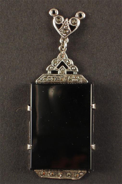 An Art Deco white metal, maracasite and black onyx pendant in the style of Theodore Fahrner stamped sterling 6cm. high